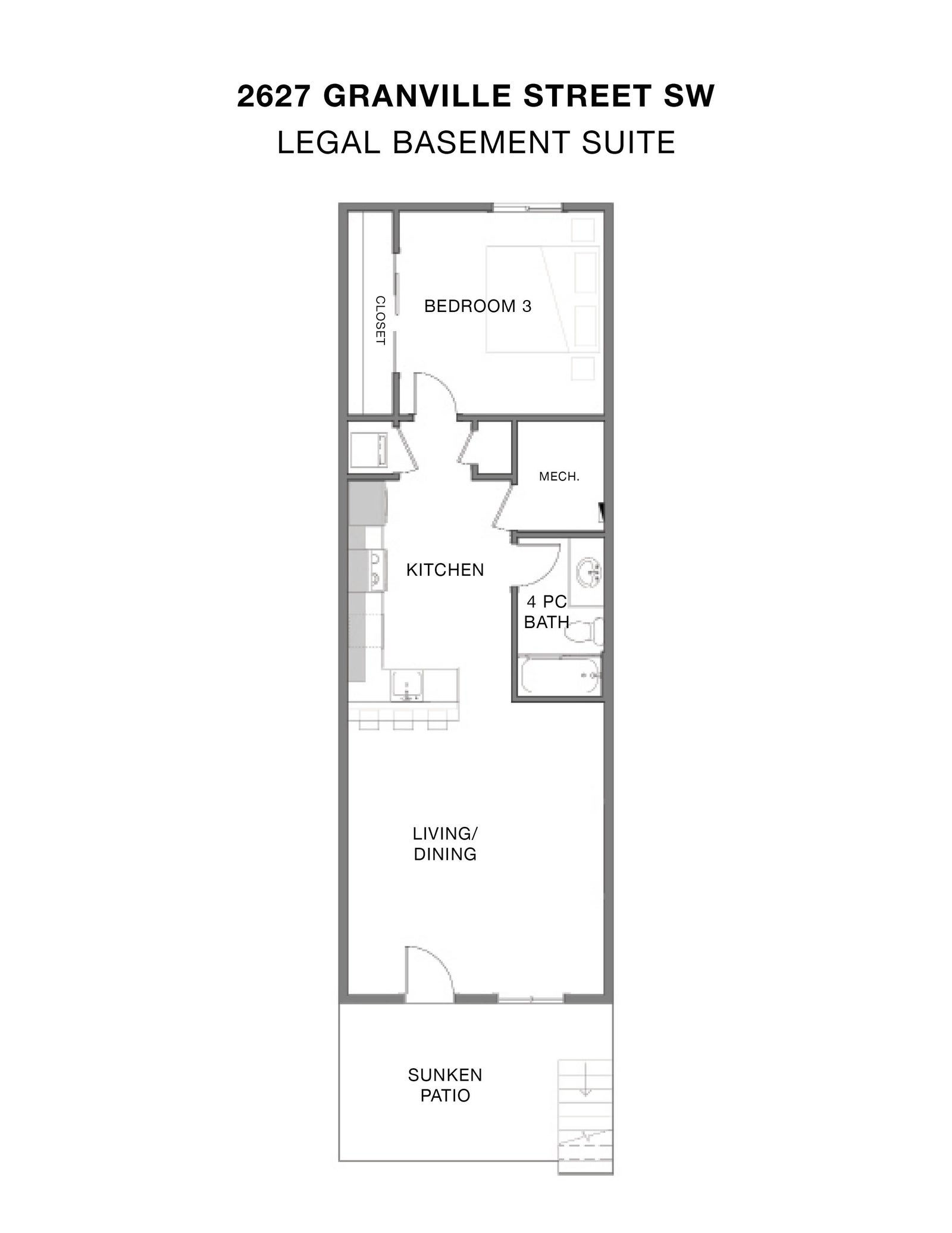 The basement suite includes a private entrance, 8.6-ft ceilings, a sunken 147 sq. ft. patio, a spacious living area, a full kitchen, a 4-piece bath, in-suite laundry, and a large bedroom.
