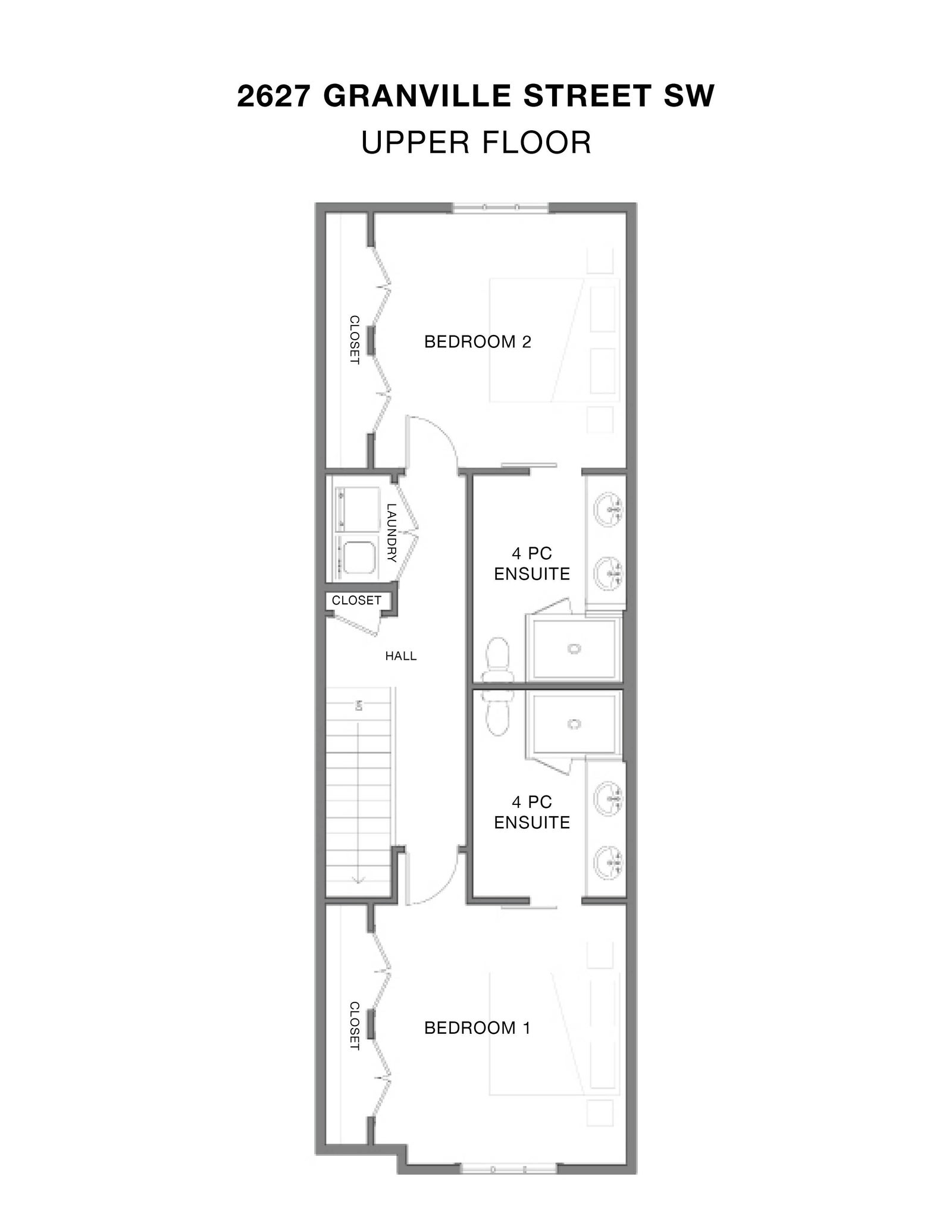 Upstairs features a bright dual-primary layout with 9-ft ceilings, each bedroom offering a massive closet and 4-piece ensuite with quartz counters, dual sinks, modern matte-black fixtures, tiled floors, and a fully tiled stand-up shower. A dedicated laundry closet with side-by-side appliances and a storage shelf, plus a linen closet in the hallway, adds convenience.