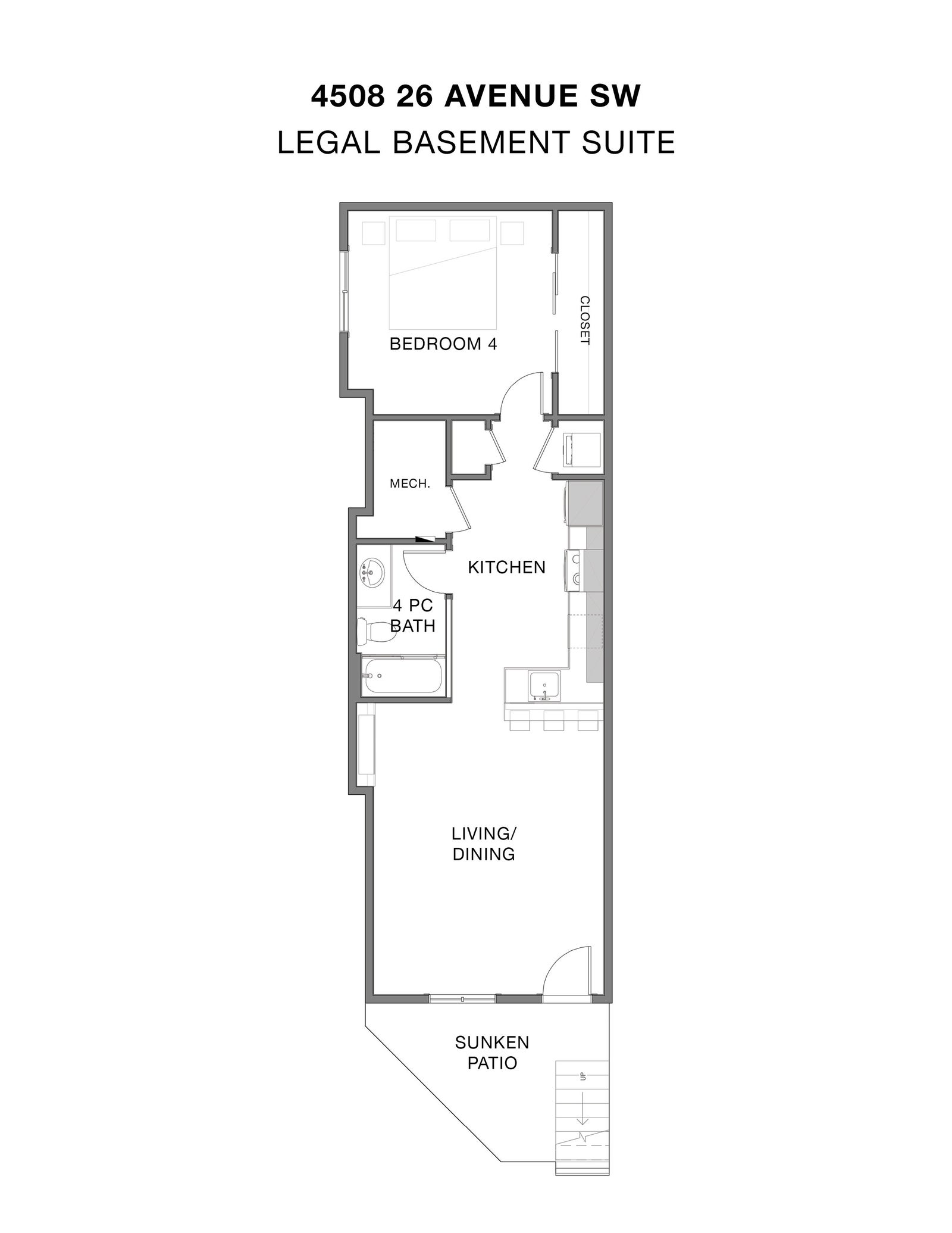 The basement suite includes a private entrance, 8.6-ft ceilings, a sunken 100 sq. ft. patio, a spacious living area, a full kitchen, a 4-piece bath, in-suite laundry, and a large bedroom.