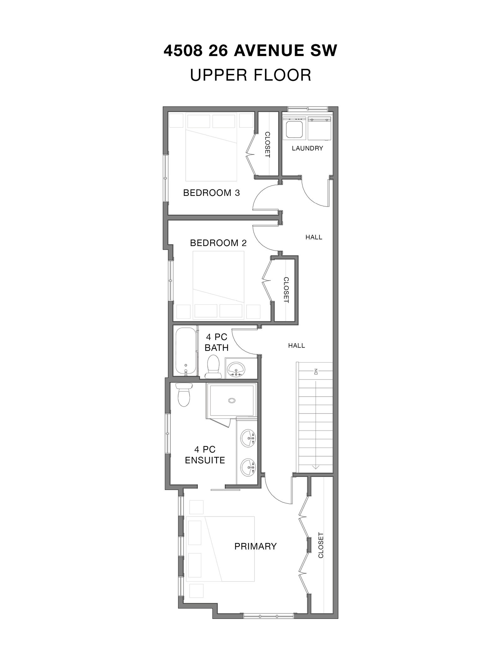 Upstairs features 3 bright bedrooms, including the spacious primary suite with a massive closet and private ensuite. The additional bedrooms each boast a closet and share the main 4-piece bath with quartz counters, extended vanity, modern matte-black fixtures, tiled floors, and a fully tiled tub/shower combo. A dedicated laundry closet with side-by-side appliances and a storage shelf adds convenience.