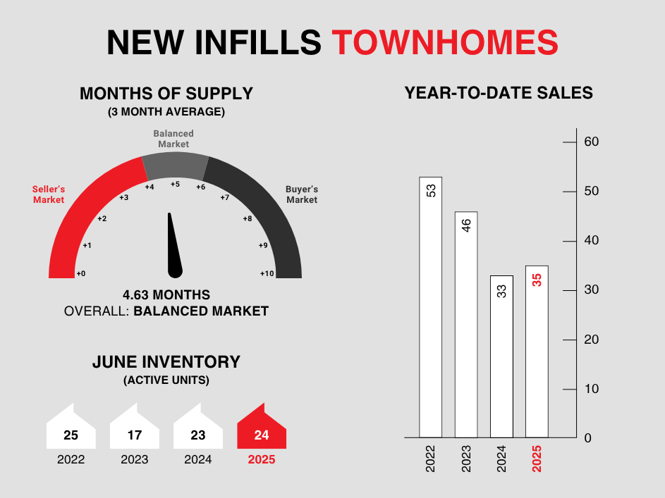 New infill townhome inventory remains unchanged with 24 active units for sale compared to last month which is up slightly from the 23 active units listed for sale at this time last year.