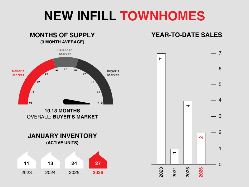 New infill townhomes posted 2 sales during the month of January, a slight increase from the 3 sales recorded last month, however down from the 4 sales recorded in January of last year.