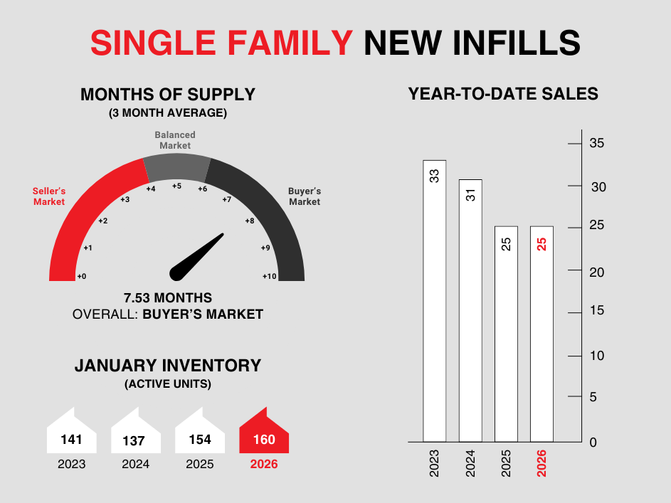 Single-family new infills posted 25 sales during the month of January, up slightly from the 23 sales recorded last month and on par with the 25 sales recorded in January of last year.