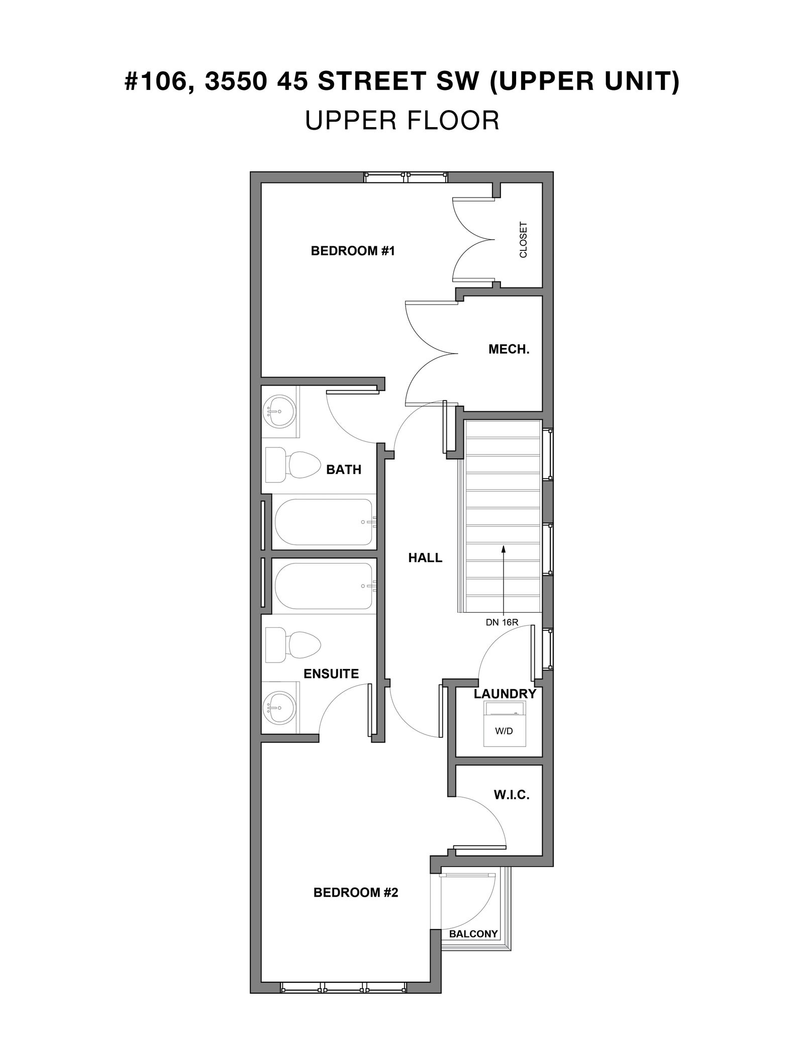 A modern spindled railing leads to the upper floor, where LVP flooring runs throughout. The spacious primary bedroom boasts a private balcony overlooking the residential street out front, plus a 3-piece ensuite bathroom. Down the hall is the well-sized second bedroom, boasting easy access to the main 4-piece bathroom. Each of these stylish upper-floor bathrooms boasts custom cabinetry, quartz counters, undermount sinks, and tiled showers. The upper floor also includes a conveniently located laundry closet, making laundry chores more accessible and hassle-free.