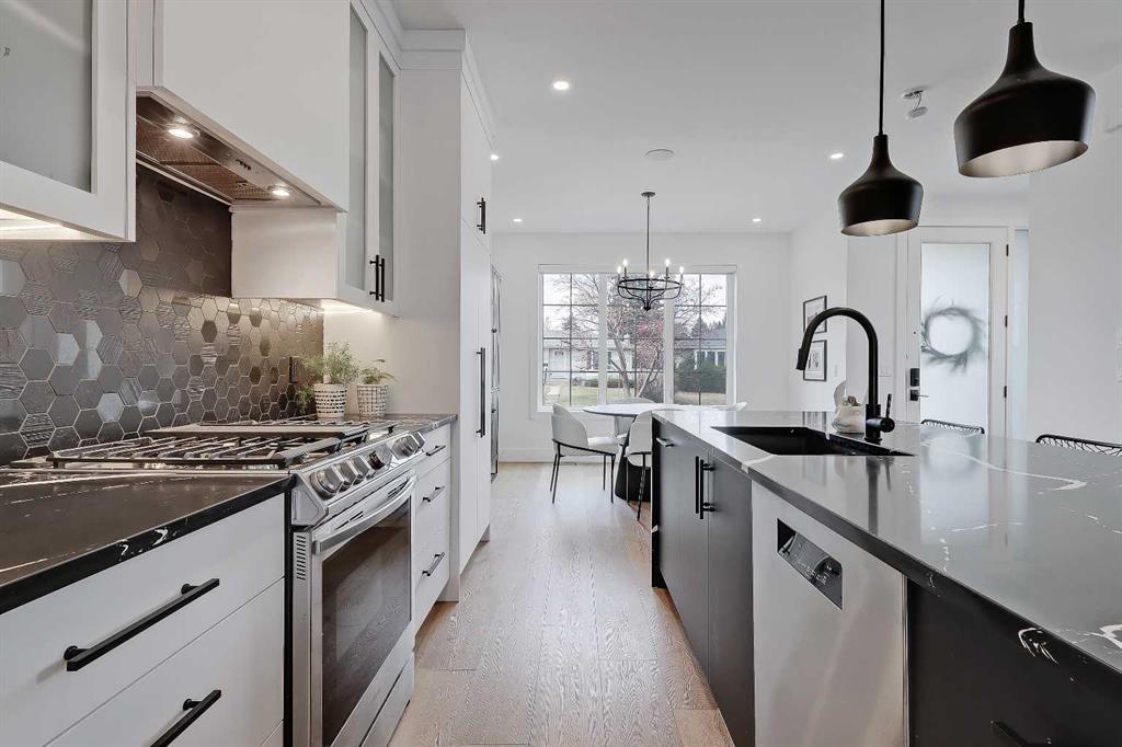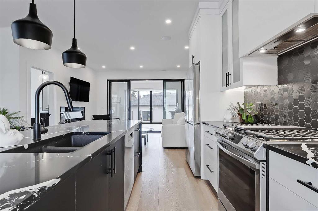 Featuring a showstopping high-contrast black and white interior design, this exceptional infill home was meticulously designed to combine style with function and is in excellent condition. The open-concept main floor features soaring 9-ft ceilings, wide-plank engineered hardwood flooring, and enormous windows for great natural light.