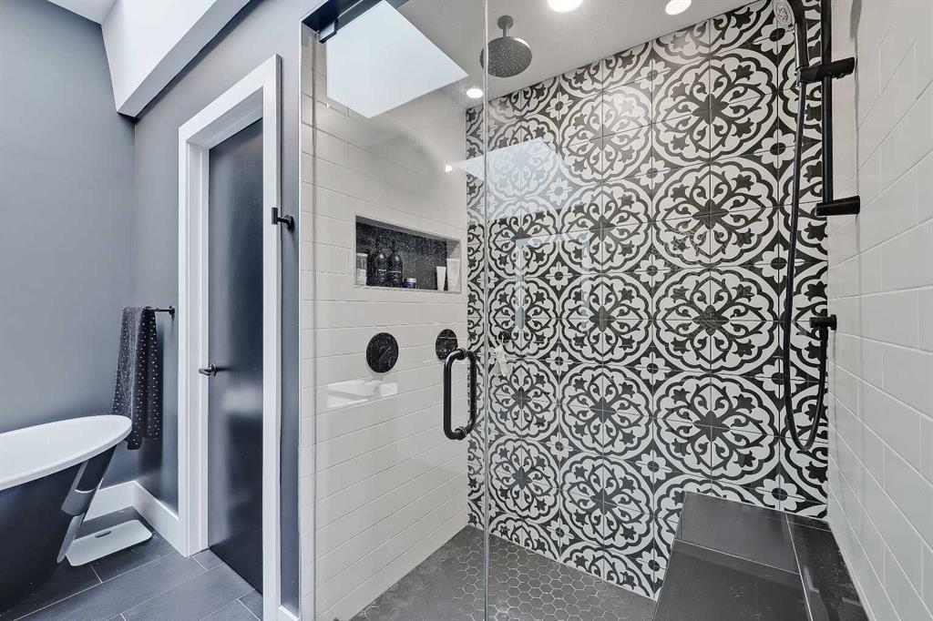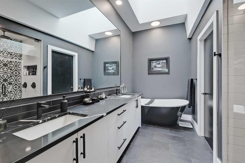 The spacious primary retreat is located at the front of the home, overlooking the quiet residential street below. With vaulted ceilings, a feature wall with wide-format fireplace, and a large walk-in closet with built-in organizers, this space offers all the bells and whistles. A sliding barn door leads to the 5-piece ensuite bathroom, with skylight, heated tile flooring, enormous vanity with dual undermount sinks, free-standing soaker tub, and spacious glass and tile shower.