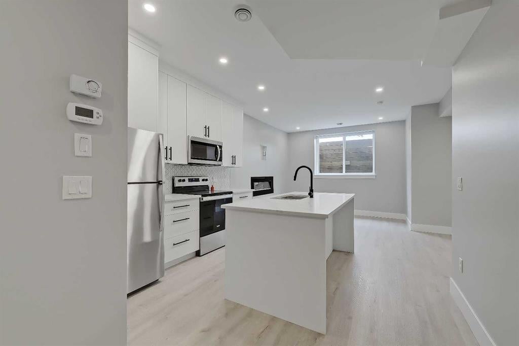 An open-concept kitchen provides plenty of cabinetry and stainless-steel appliances, plus a large island with breakfast bar seating. Adjacent is both a dining area and a living room with fireplace – a rarity in basement suites these days.