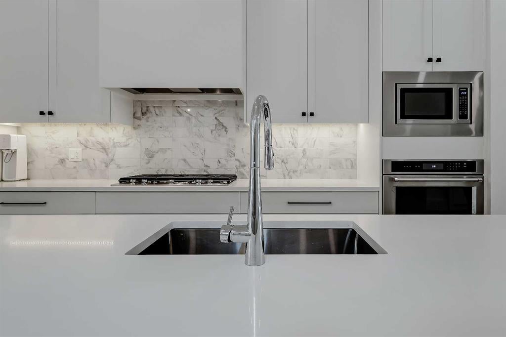 Beyond, the chef’s dream kitchen awaits. Showcasing abundant crisp white cabinetry, including pull-out recycling and garbage bins, and a rare corner pantry. Top-of-the-line KitchenAid stainless steel appliances—including a 5-burner gas range, French-door fridge/freezer, and built-in wall oven and microwave—are complemented by an oversized central island with quartz counters and plenty of room for bar seating - perfect for casual gatherings.