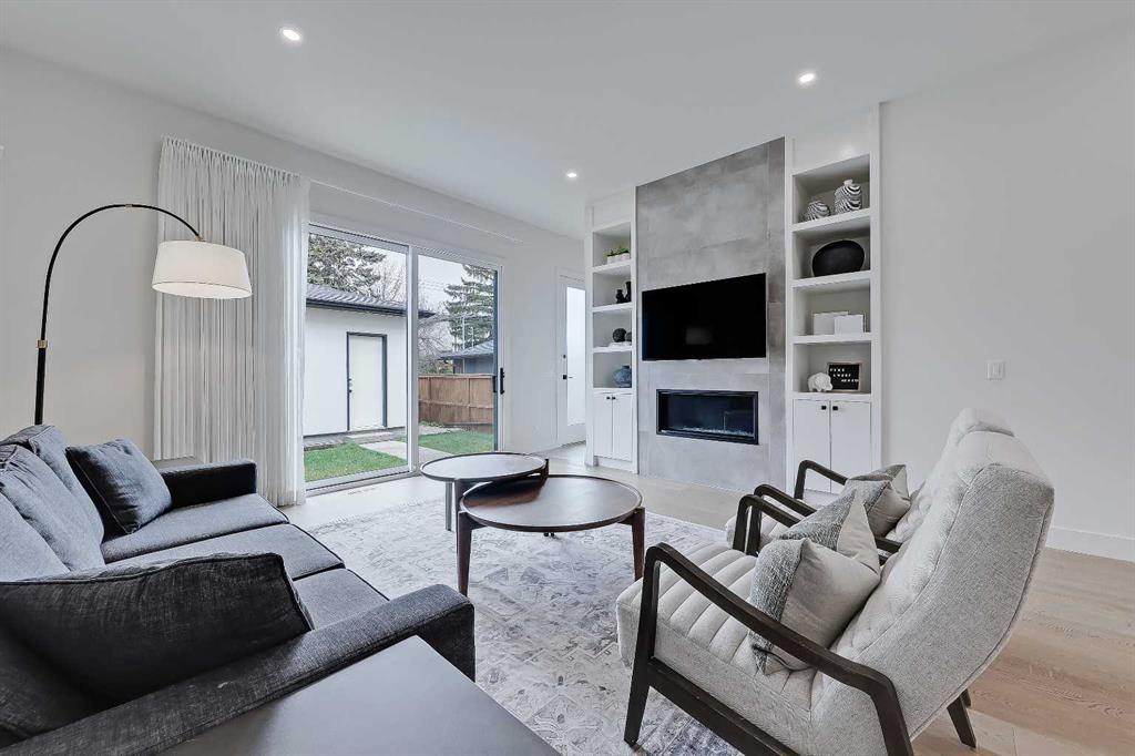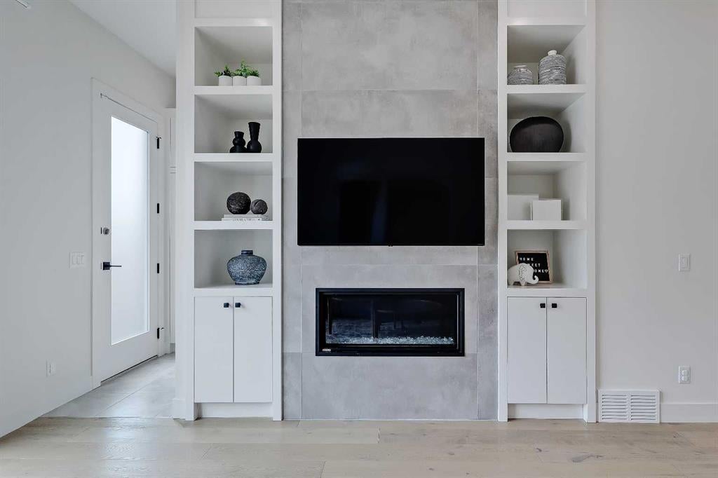 In the rear living room, a custom tiled feature wall frames a gas fireplace and bespoke shelving, creating a natural focal point for cozy evenings or lively conversation. Massive glass sliding doors lead you outside to the fully fenced backyard, where a concrete aggregate patio with a gas line sits ready for summer BBQs, and lush lawn areas beckon for games or gardening.