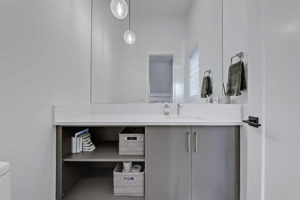 Nearby, the mudroom—tucked discreetly from view—features built-in bench seating, shelving, and two storage closets to keep things neat and tidy, while the tiled flooring allows for easy maintenance and cleaning up! A secluded 2-piece powder room boasts a quartz vanity and designer tile that mirror the home’s clean, modern palette, completing the main floor.