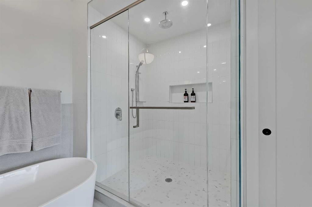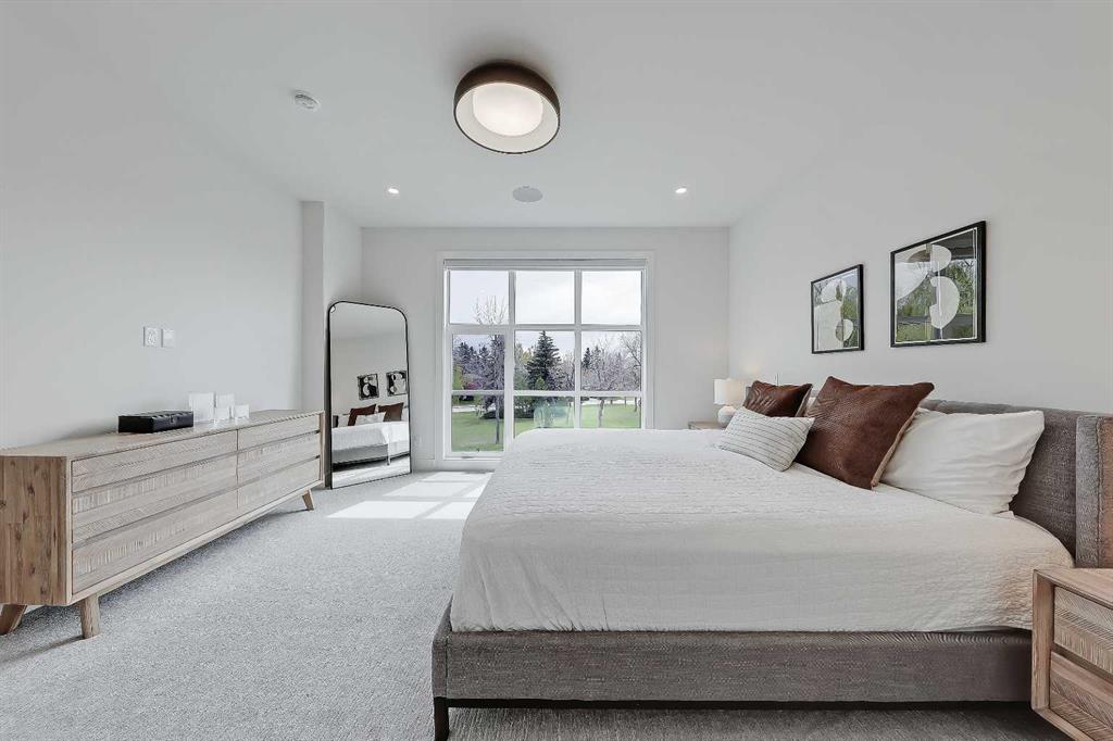 Your private retreat awaits—a sweeping primary suite overlooking the green space, complete with an expansive walk-in closet with built-in organizers and a lavish 5-piece ensuite. A dual-sink quartz vanity, a free-standing soaker tub, a glass-enclosed fully tiled stand-up shower, heated tiled floors, and a separate water closet all define the spa-like ambiance.