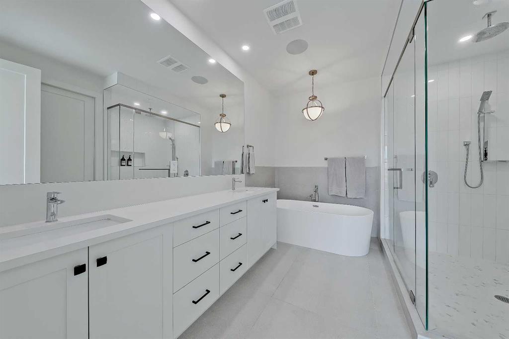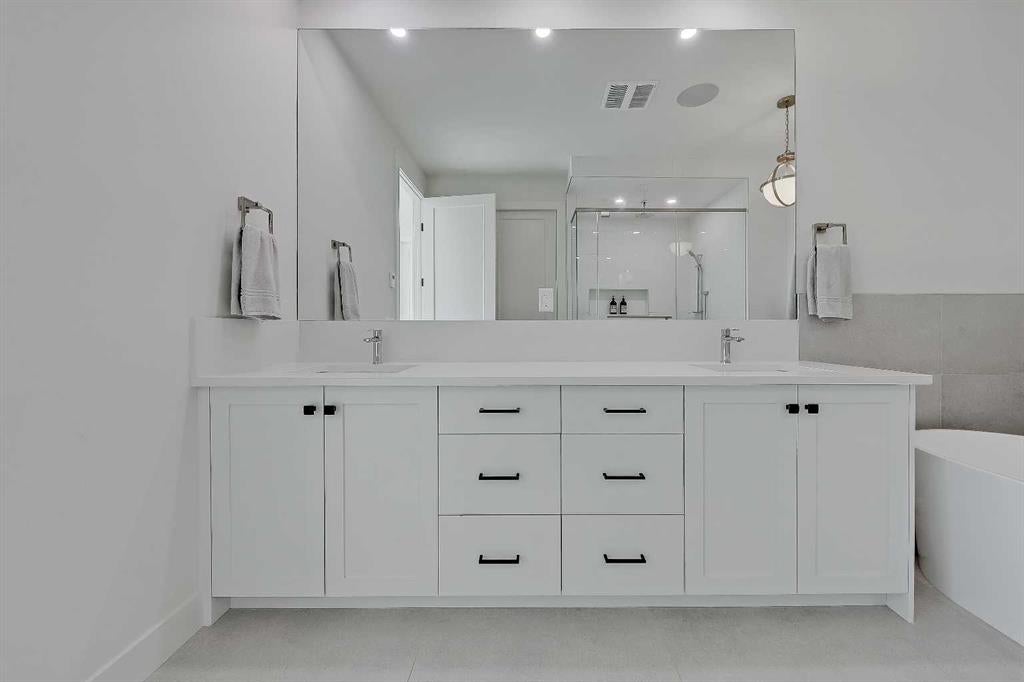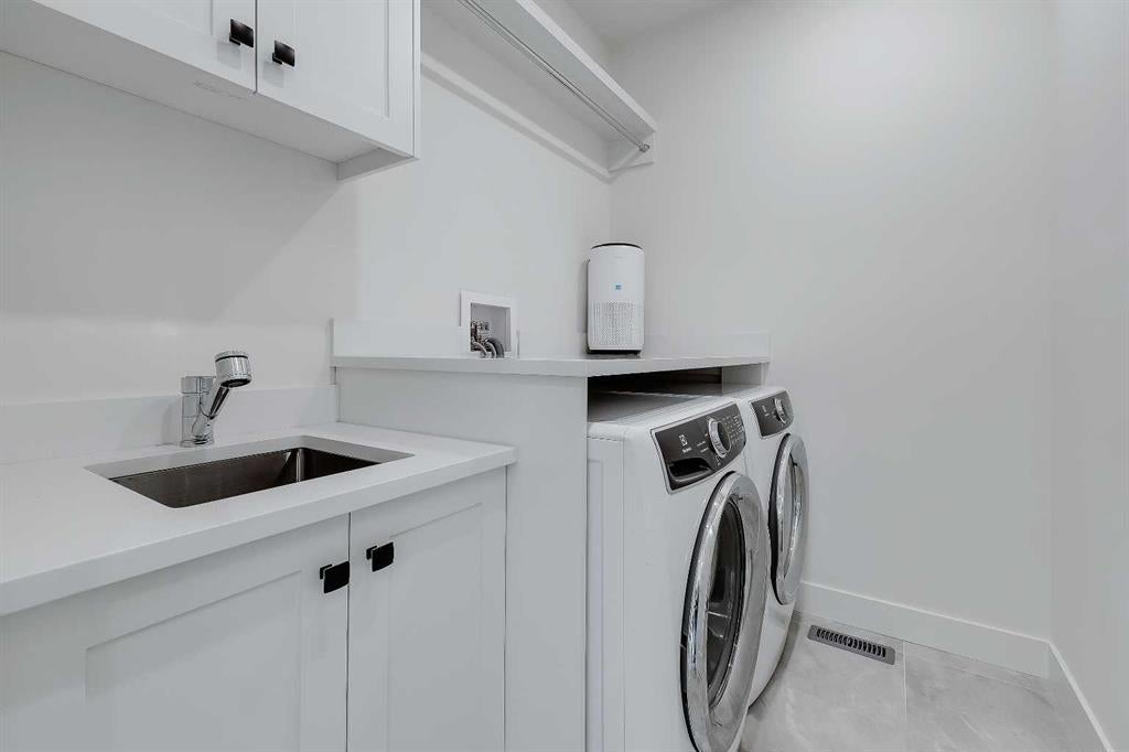 Two additional bedrooms, located down the hall, are generously sized and bright, and share the main 4-piece bathroom, finished with an extended quartz vanity and a tub/shower combo. Practicality meets luxury in the formal laundry room, where side-by-side appliances, a quartz folding station, a sink, a hanging rod, and extra storage make chores feel effortless.
