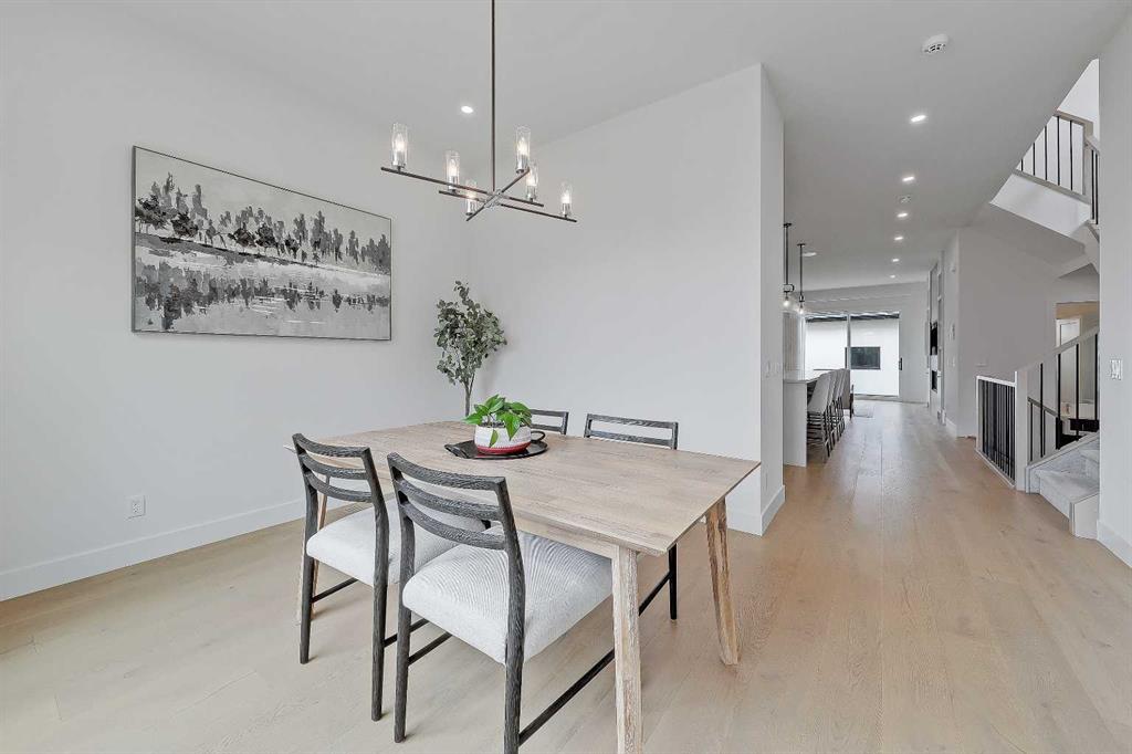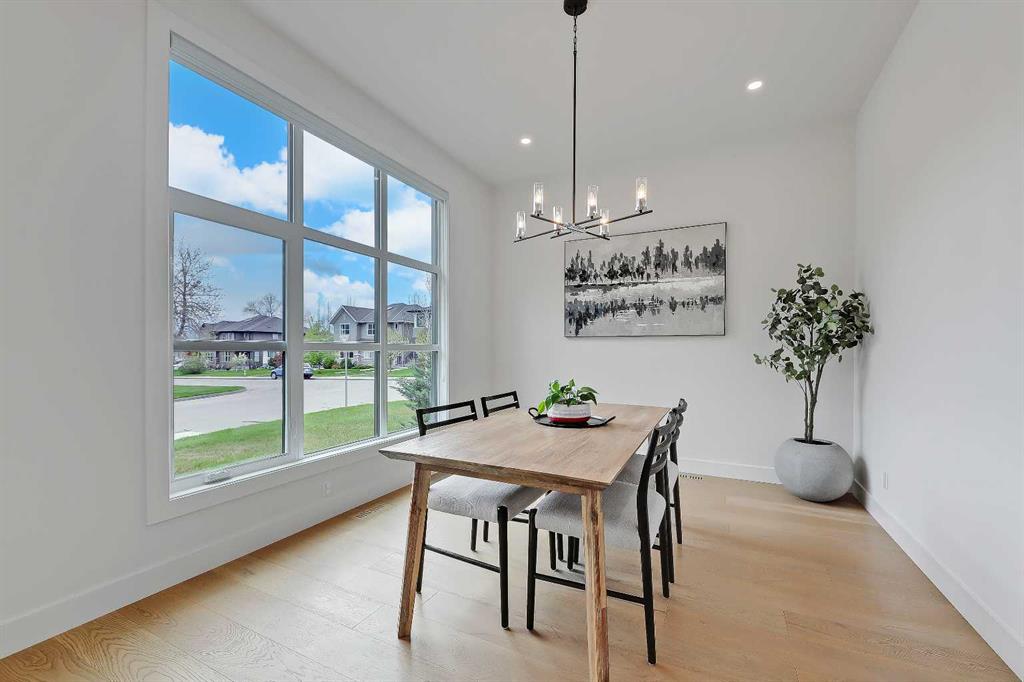 The formal dining area, positioned just off the foyer and illuminated by the oversized Lux picture window, feels airy and sophisticated, offering ample space for an oversized table and sideboard.
